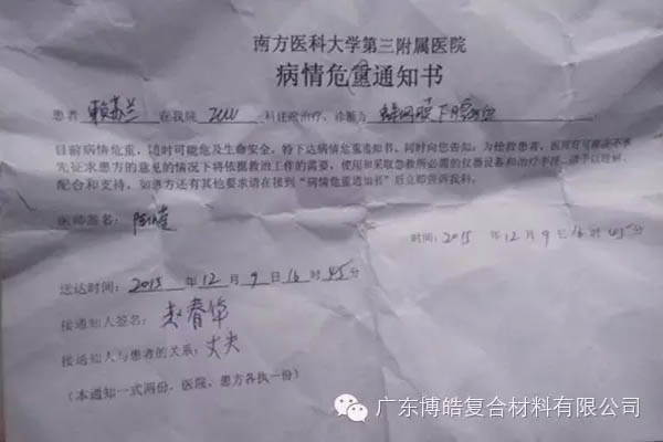 廣東博皓復合材料有限公司董事長經熟人轉述得知此事,不僅積極號召身邊人,發動小型的微信捐資活動,還從博皓愛心基金支出5000元人民幣,為這位生病的母親加油。當公司代表賴建明將5000元現金交到賴蘇蘭丈夫手中的時候,他稍稍有點哽咽。從當時這位憨厚的丈夫百味交集的表情中可以看出,作為家里的頂梁柱,不管平日多么堅強,當面對自己的親人被病魔纏身之時,又是多么的無助。看著這位被病痛折磨之下的45歲的媽媽,你很難相信她就是那個沒日沒夜加班只為讓家人可以稍微寬裕的母親,此刻,她無力的蜷縮在被窩里,嘴唇蒼白,臉色鐵青,雙眼無力的看著一滴滴藥水順著被針扎的凸起的血管流入身體,那就是她的希望,或許她和其他母親一樣,正在思考,大女兒是否穿暖,小女兒有無吃飽……..